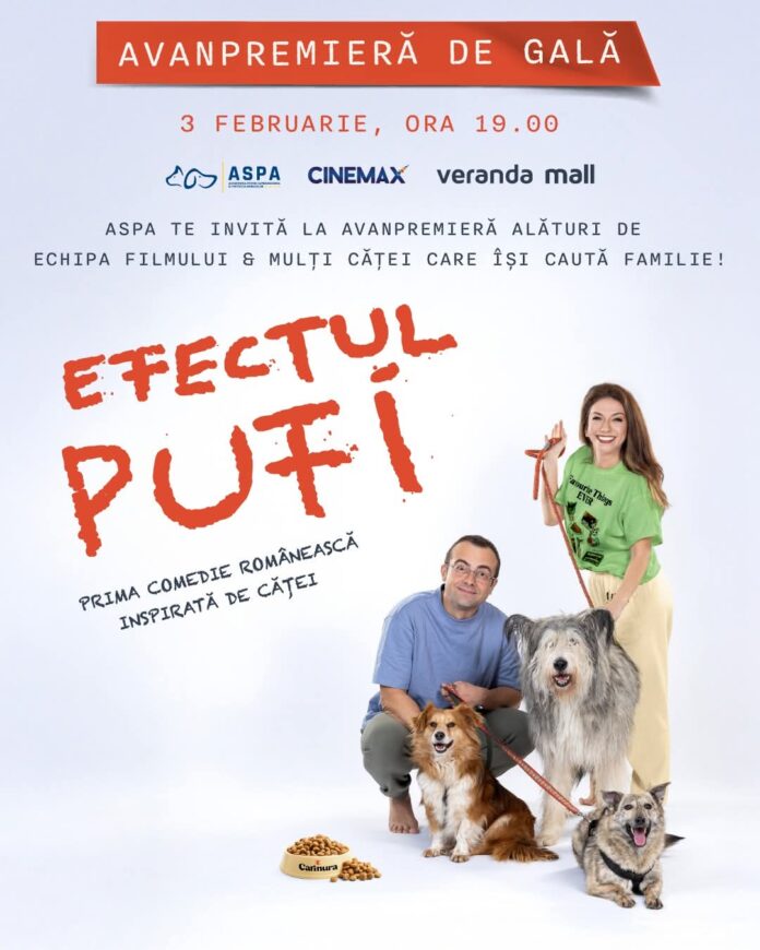 Marți, 3 februarie, la Cinemax Veranda Mall, cinci căței din adăposturile ASPA vor lua parte la avanpremiera de gală a filmului „Efectul Pufi – Filmul”. Aceștia vor avea ocazia să se bucure de atmosfera specială a evenimentului și de atenția celor prezenți, având șansa să își găsească o nouă familie. Conform newsbucuresti.ro, filmul „Efectul Pufi” promovează iubirea față de oameni și animale.